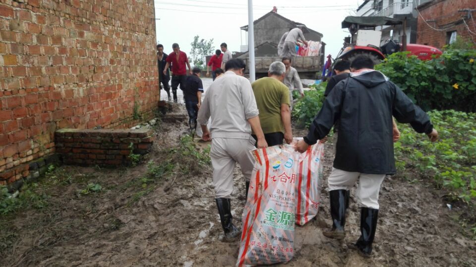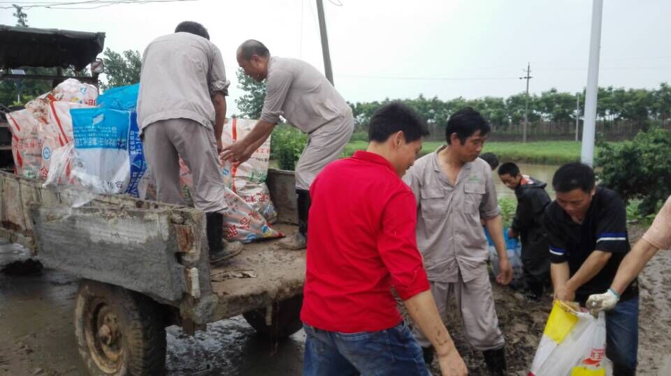 太白湖村是个典型的水袋子村,田多地少,防汛用土资源馈乏,经当地村干部协调才在一家民宅前的一块菜园地里取土,根据当地防汛指挥部统一安排美天防汛突击队专门负责取土装袋,运至拖拉机上,当地干群则负责将运来的沙包筑子堤。在现场笔者看到整个劳动场面没一个闲人,铲土的铲土,牵袋口的牵袋口,扛包的扛包,只听见铁锹铲土发出阵阵沙沙的声响,大家心系灾情,劳动热情高涨,踩着泥泞,来回穿梭,身上,脸上被泥水、汗水染黄了,有的同志手上被铁锹柄磨起了血泡,但未见他们叫一声苦,道一声累,截至笔者发稿时止美天生物抢险突击队取土九车,共45吨,累计1286袋。