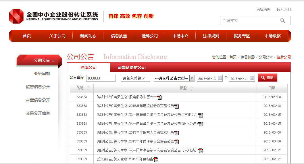 2016年4月8日,全国中小企业股份转让系统发布公告《美天生物股票解除限售公告》。雷火在线官网证券代码为833833,证券简称美天生物,主办券商为申万宏源。本批次股票解除限购数量总额为29682395股,占公司总股份的比例为58.29%,可转让时间为2016年4月15日。具体信息详见公司在股转系统发布2016-007号公告。